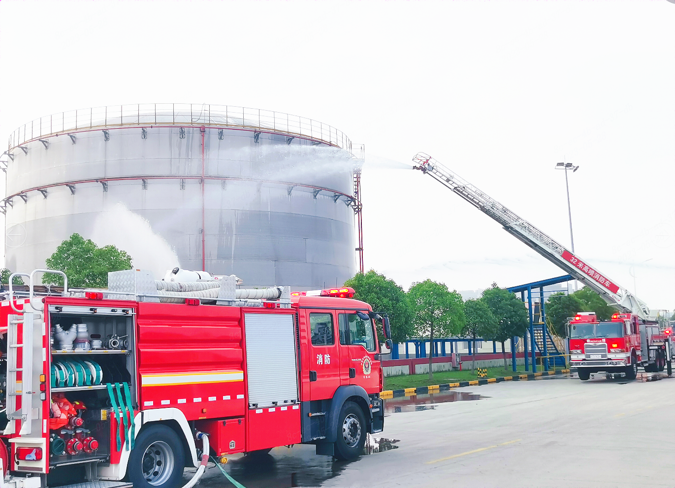 現場模擬了乙二醇E罐區泄漏著火,火勢較大難以控製的緊急情況。事故發生後,現場工作人員第一時間啟動應急預案,向相關部門領導報告,並隨即聯係企業消防隊報警,同時對值班室及碼頭相關人員進行疏散。國望消防隊到達現場後啟動內部消防設施,進行先期滅火和堵截火勢。吳江區消防救援大隊指揮中心隨即接警出動,調派各中隊前往現場增援。