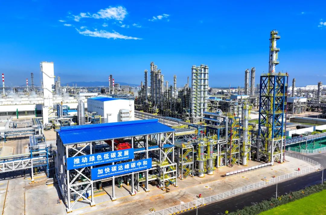 據介紹,石化生產過程中排放的二氧化碳被捕集後,與氫氣發生化學反應形成甲醇,隨後通過係統管廊進入下遊裝置,用於製造鋰電池電解液溶劑、光伏膜材料等,形成了“二氧化碳捕集利用—綠色甲醇—新能源材料”的負碳產業鏈。